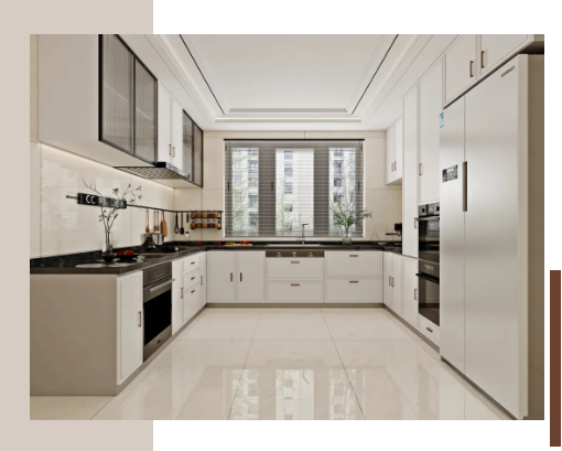 瑞金米黃,以米黃色作為磚面底色,與細膩清晰的白色紋理相互交融,恍如陽光灑落于大地之上。極具質感的U型櫥柜,在滿足儲物需求的同時,細微之處帶給家居生活無限的柔和美感。