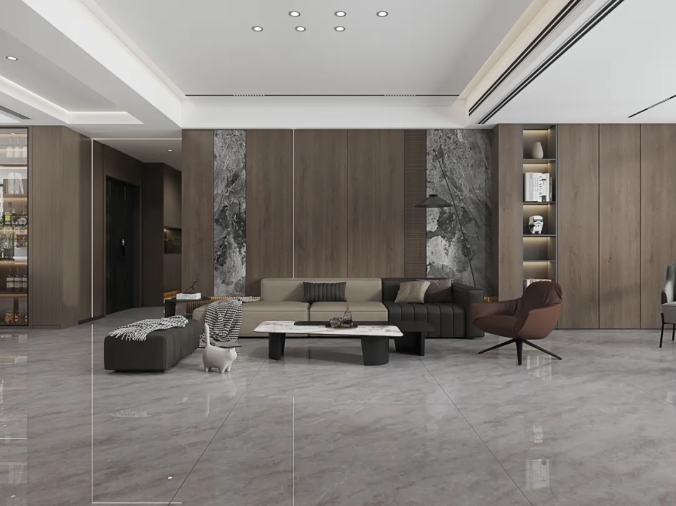 極簡的素色客廳中,冰瑩玉瓷磚如凝霜鋪地,清冽的紋理與大地色軟裝相映,綠植點綴間,冷調空間盡顯溫馨與自然。