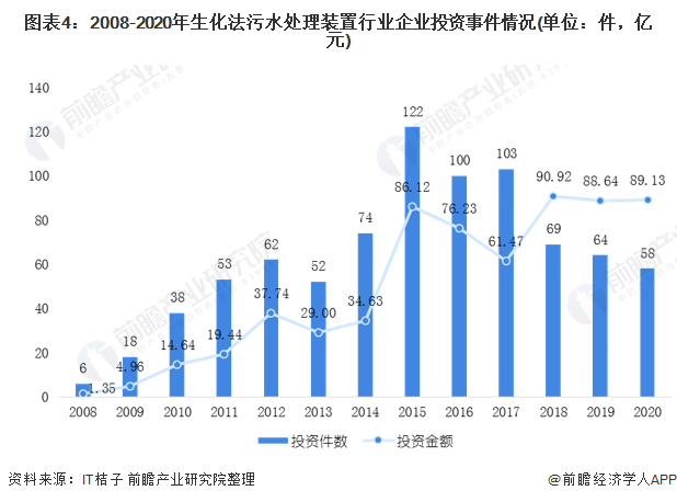 根據it桔子的數據顯示,2008-2020年生化法污水處理裝置行業企業投資事件呈現波動趨勢。在2015年,生化法污水處理裝置行業企業投資事件達到近年來峰值122件,但投資金額為86.12億元。從投資金額角度來看,在2018年,生化法污水處理裝置行業企業投資達到了近年來峰值90.92億元。